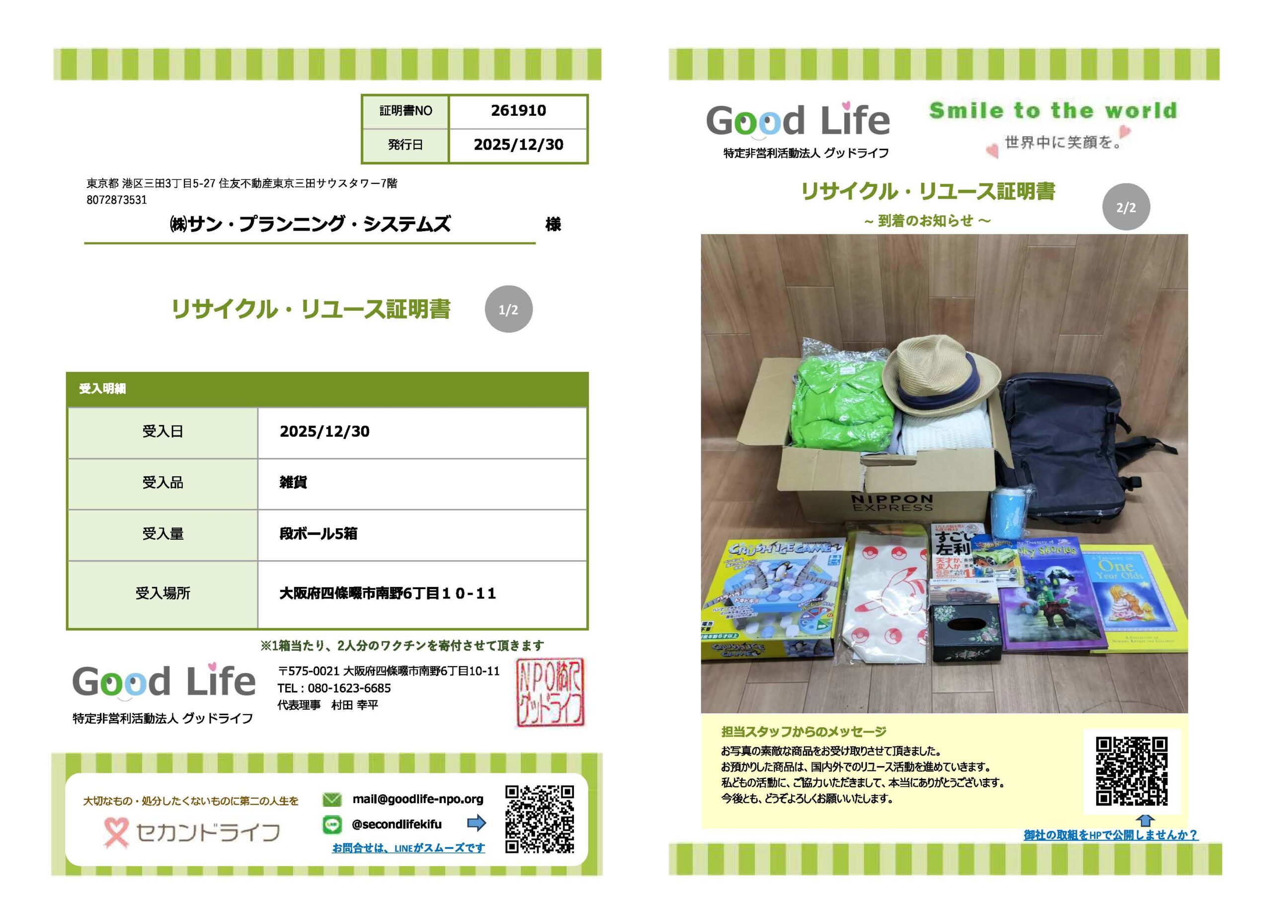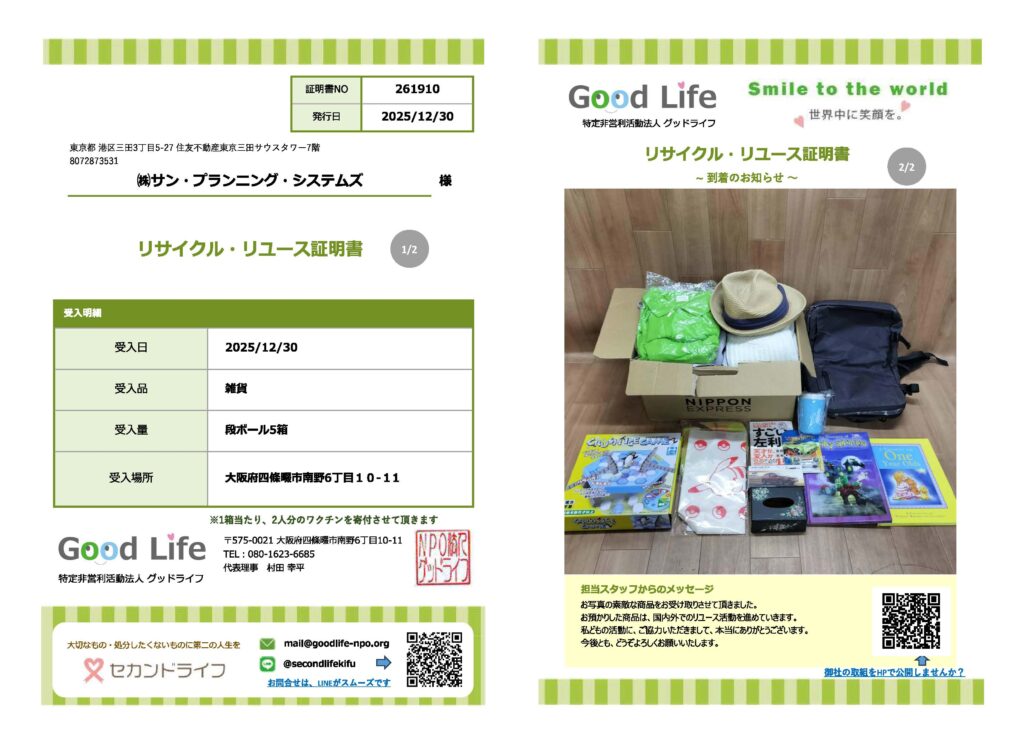 社会貢献活動の一環として、2025年10月20日~11月28日に社員から古着等の不用品を回収し、NPO法人 セカンドライフ様へ寄付いたしました。
