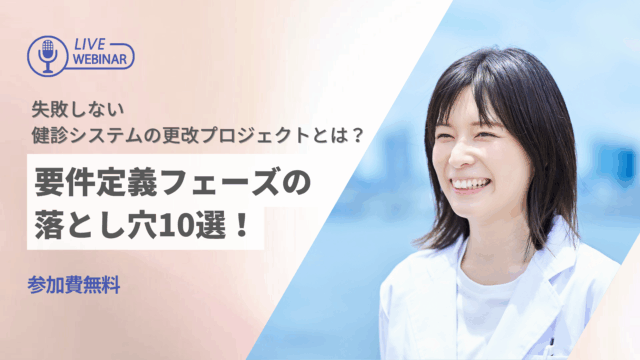 • 【セミナー】知らなきゃ損!失敗しない健診システムの更改プロジェクトとは?要件定義フェーズの落とし穴10選!